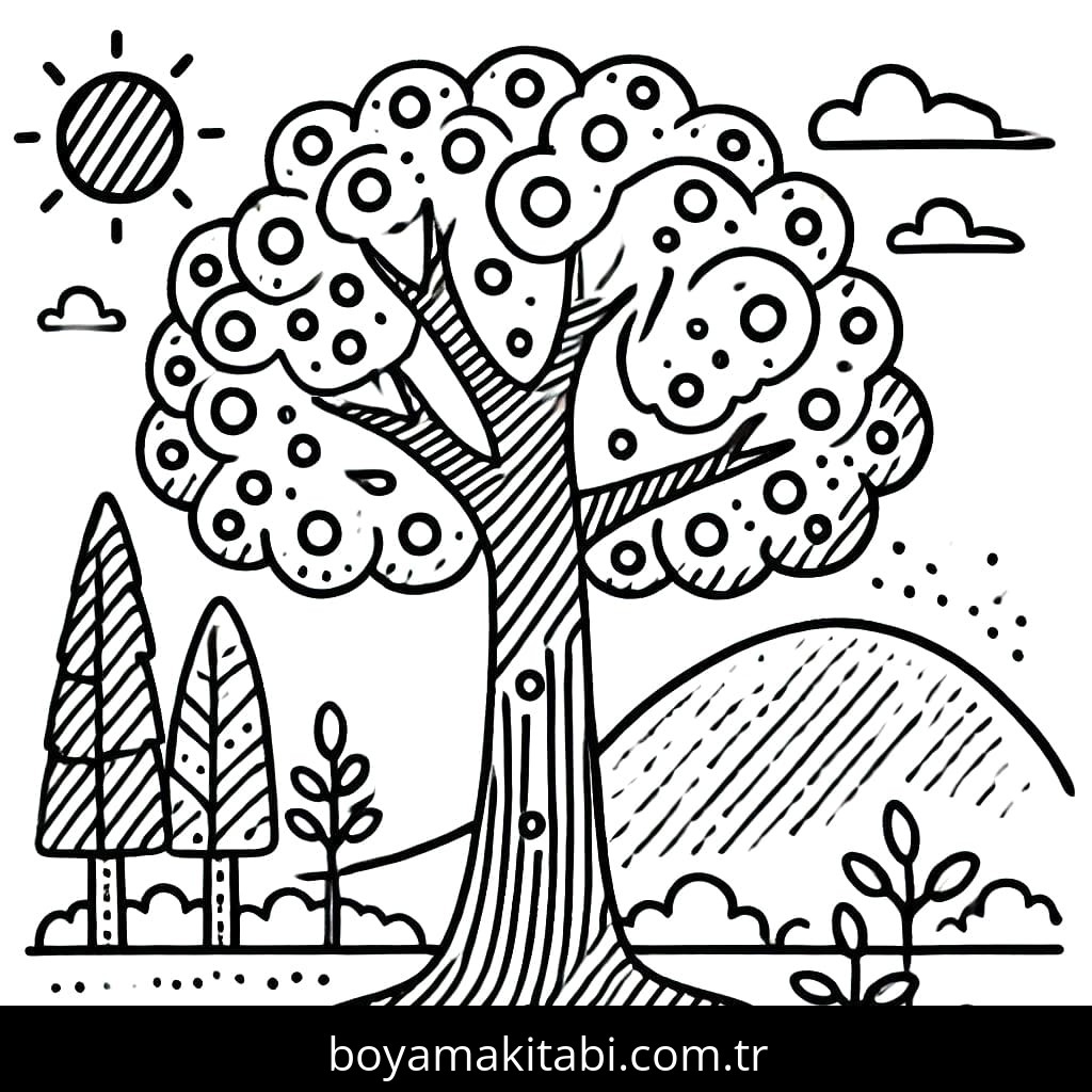 Ağaç temalı bu boyama sayfası çocuklar için el becerilerini geliştirir ve boyama çalışması bir etkinlik sunar. Ücretsiz olarak indirip yazdırabilir, evde keyifli bir boyama zamanı oluşturabilirsiniz.