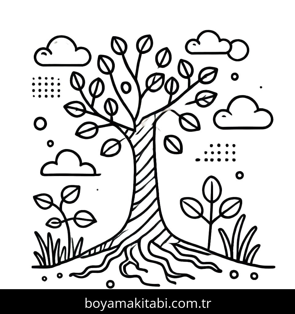 Ağaç temalı bu boyama sayfası çocuklar için çocuklar için ve çizgi film temalı bir etkinlik sunar. Ücretsiz olarak indirip yazdırabilir, evde keyifli bir boyama zamanı oluşturabilirsiniz.