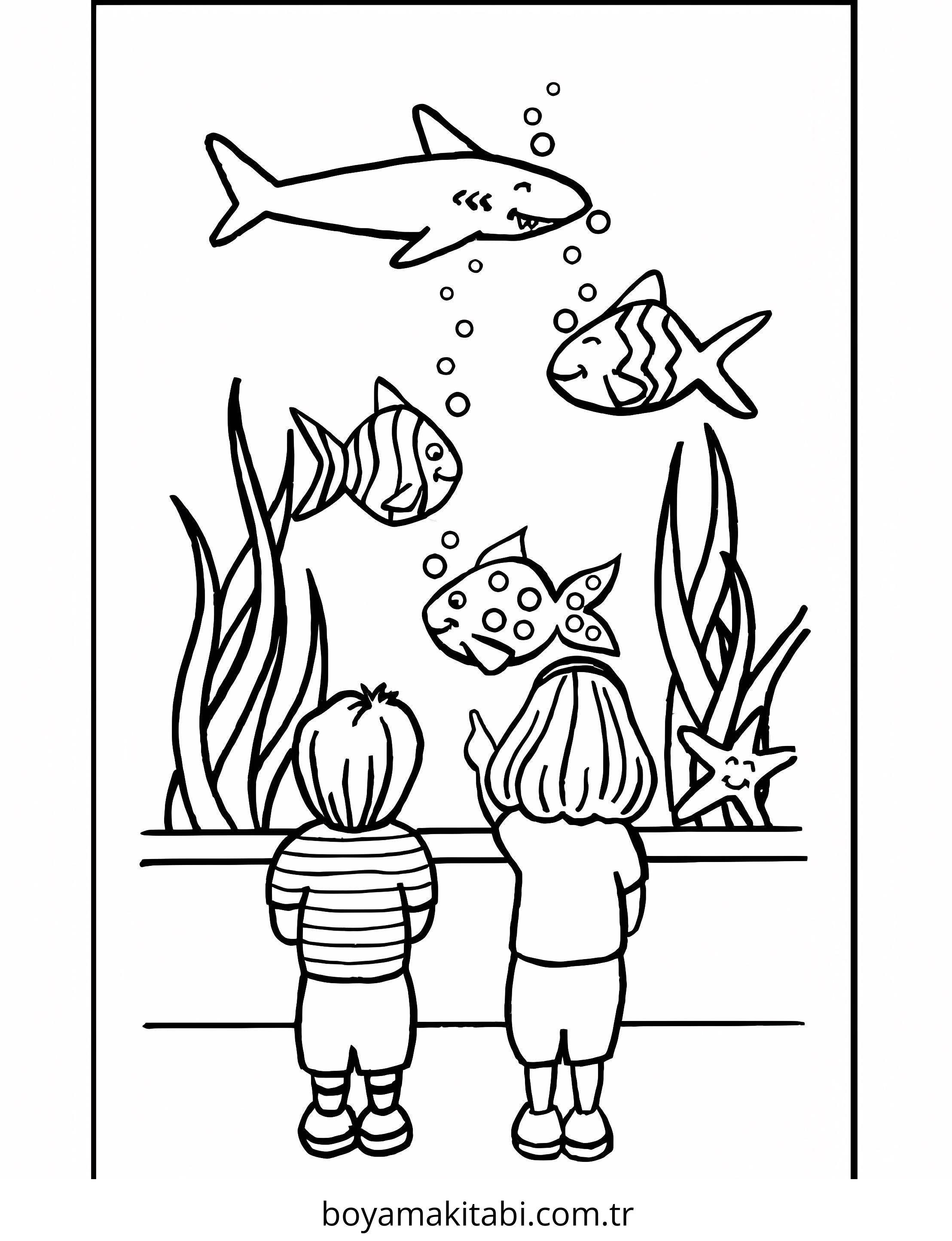 Akvaryum temalı bu boyama sayfası çocuklar için renkli çizimler ve okul öncesi bir etkinlik sunar. Ücretsiz olarak indirip yazdırabilir, evde keyifli bir boyama zamanı oluşturabilirsiniz.
