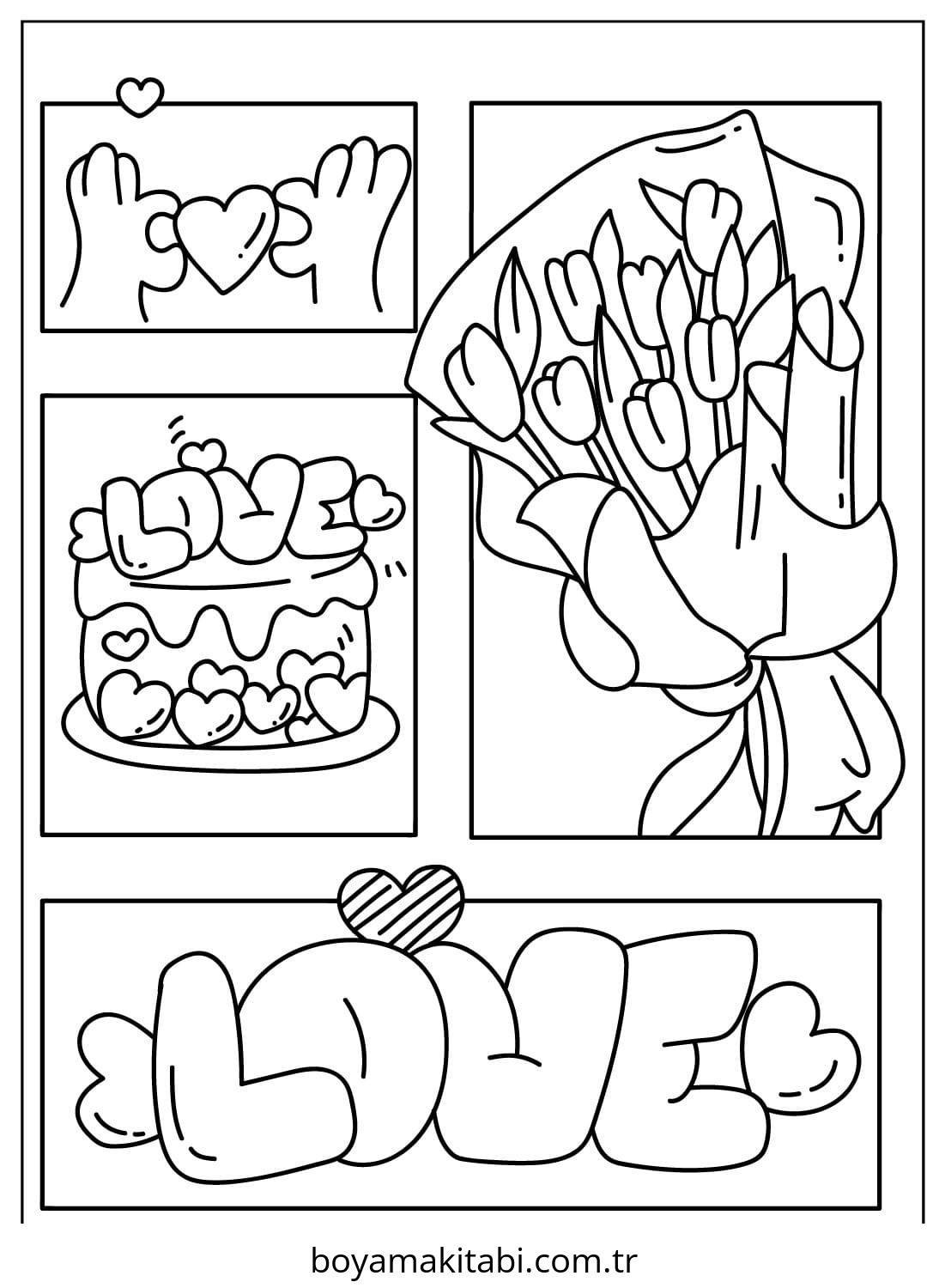 Aşk temalı bu boyama sayfası çocuklar için el becerilerini geliştirir ve boyama çalışması bir etkinlik sunar. Ücretsiz olarak indirip yazdırabilir, evde keyifli bir boyama zamanı oluşturabilirsiniz.