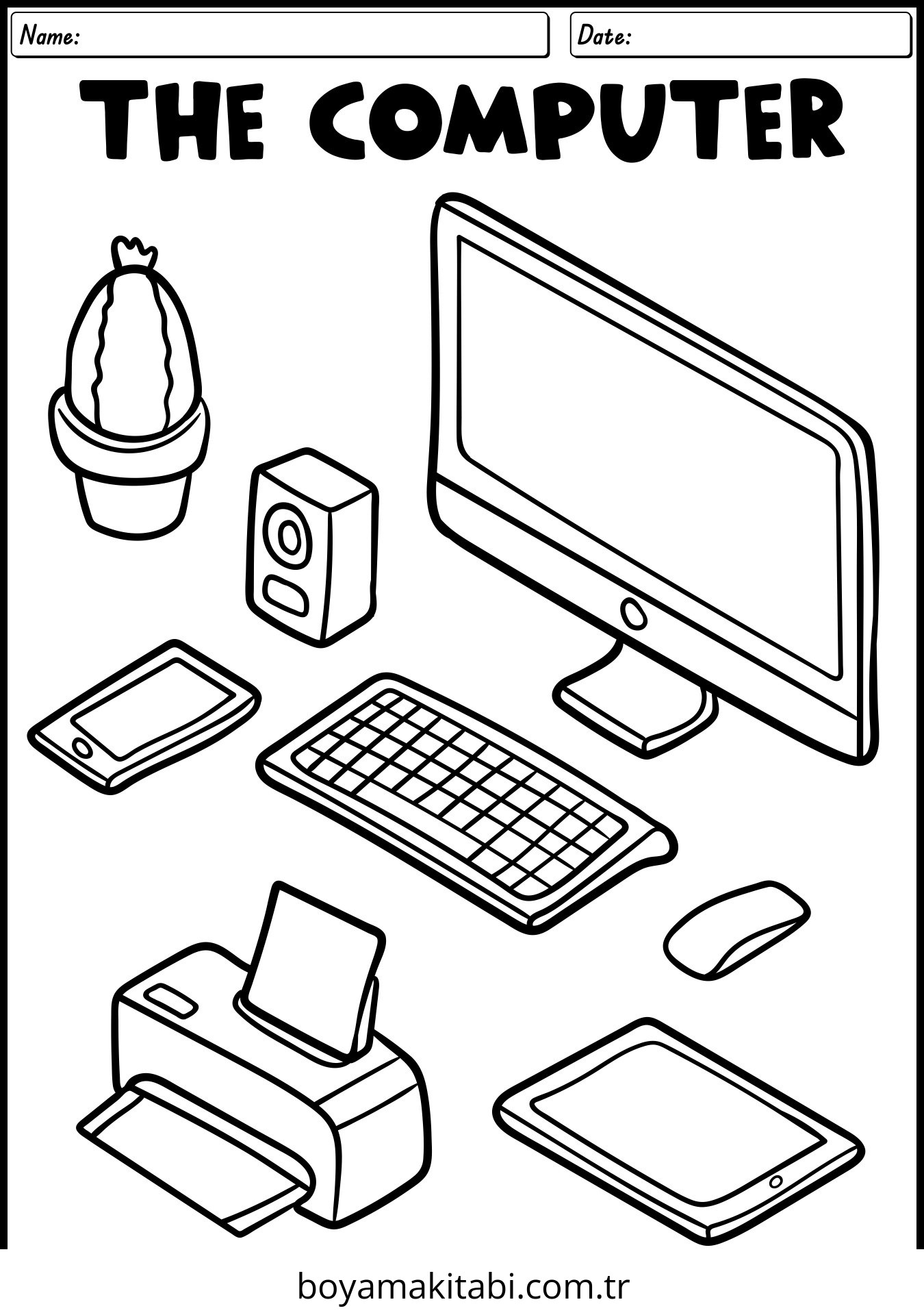Bilgisayar temalı bu boyama sayfası çocuklar için evde etkinlik ve ücretsiz yazdır bir etkinlik sunar. Ücretsiz olarak indirip yazdırabilir, evde keyifli bir boyama zamanı oluşturabilirsiniz.