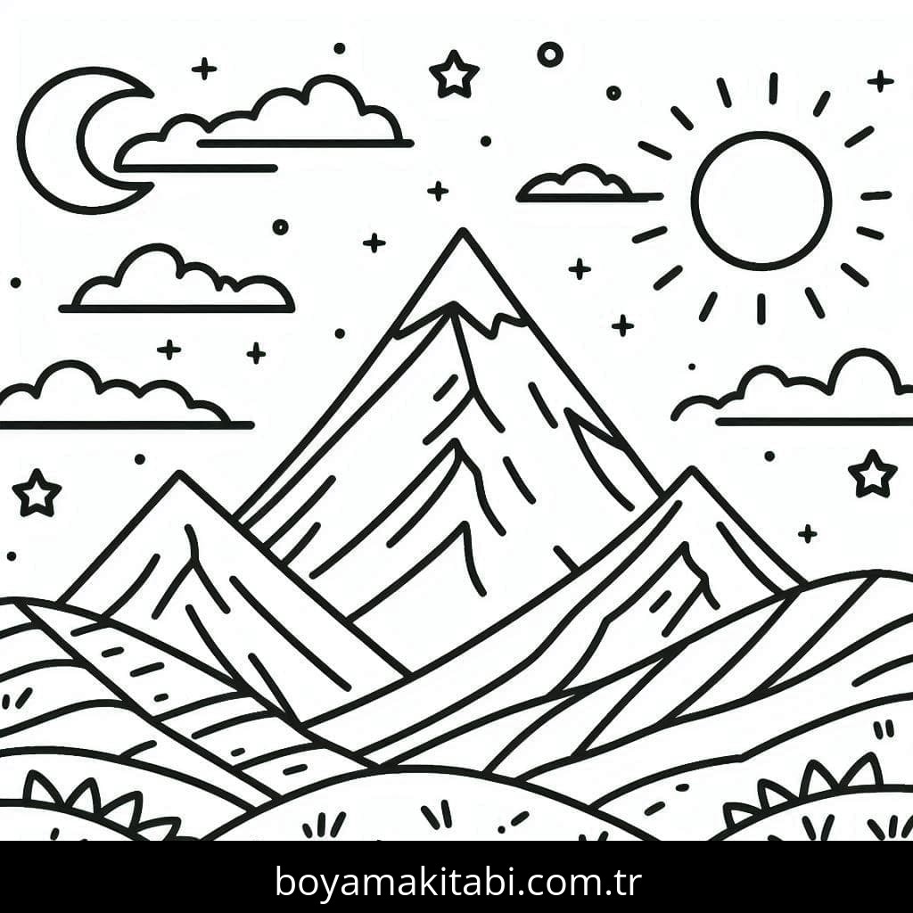 Dağ temalı bu boyama sayfası çocuklar için çizgi film temalı ve basit çizim bir etkinlik sunar. Ücretsiz olarak indirip yazdırabilir, evde keyifli bir boyama zamanı oluşturabilirsiniz.
