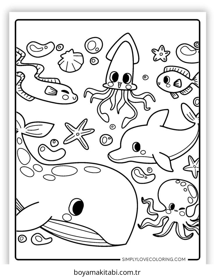 Deniz Hayvanları temalı bu boyama sayfası çocuklar için evde etkinlik ve ücretsiz yazdır bir etkinlik sunar. Ücretsiz olarak indirip yazdırabilir, evde keyifli bir boyama zamanı oluşturabilirsiniz.