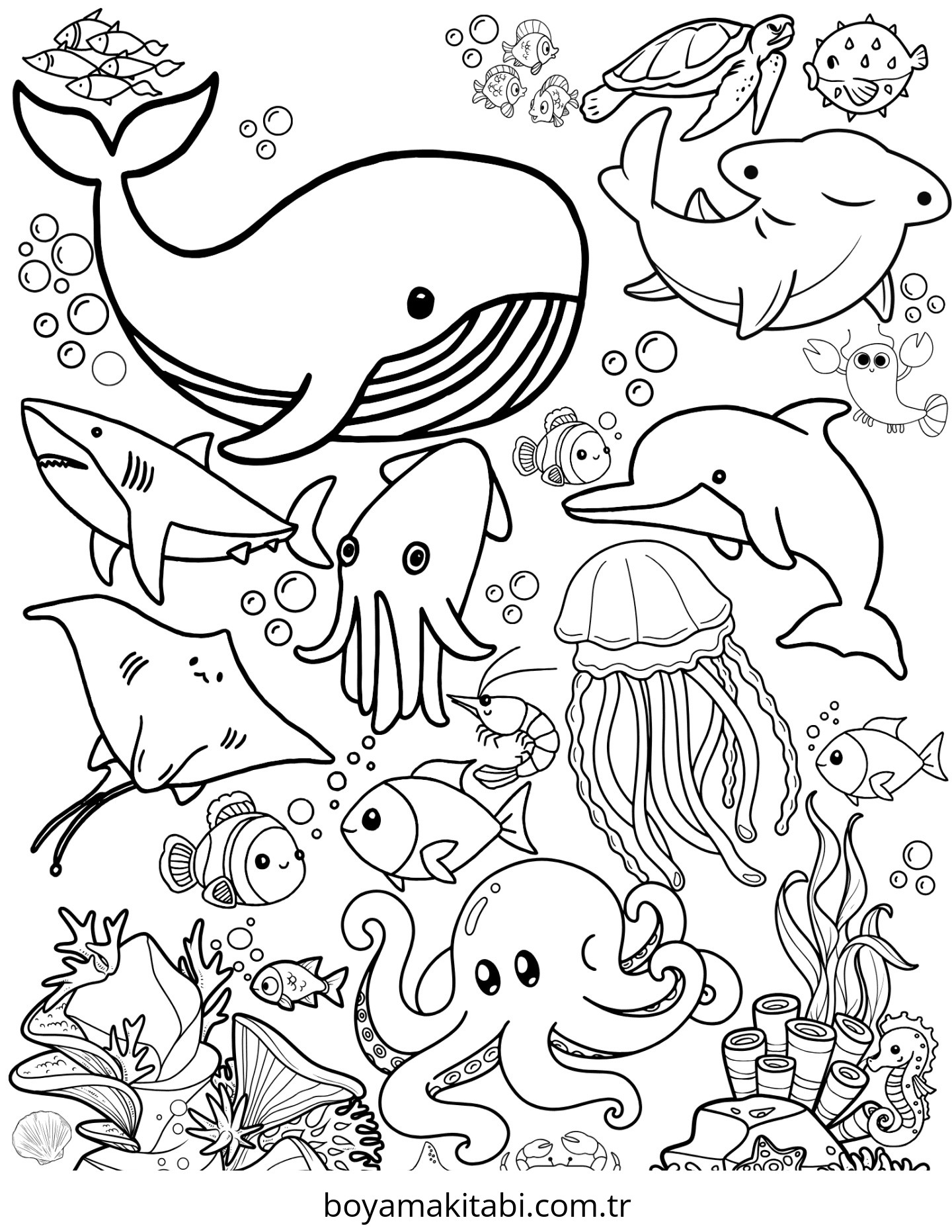 Deniz Hayvanları temalı bu boyama sayfası çocuklar için keyifli zaman ve renkli çizimler bir etkinlik sunar. Ücretsiz olarak indirip yazdırabilir, evde keyifli bir boyama zamanı oluşturabilirsiniz.