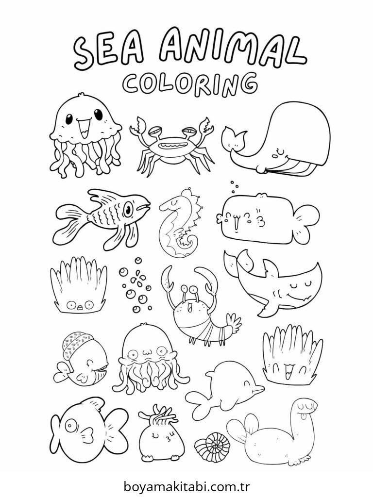 Deniz Hayvanları temalı bu boyama sayfası çocuklar için sanatsal çalışma ve çocuklar için bir etkinlik sunar. Ücretsiz olarak indirip yazdırabilir, evde keyifli bir boyama zamanı oluşturabilirsiniz.