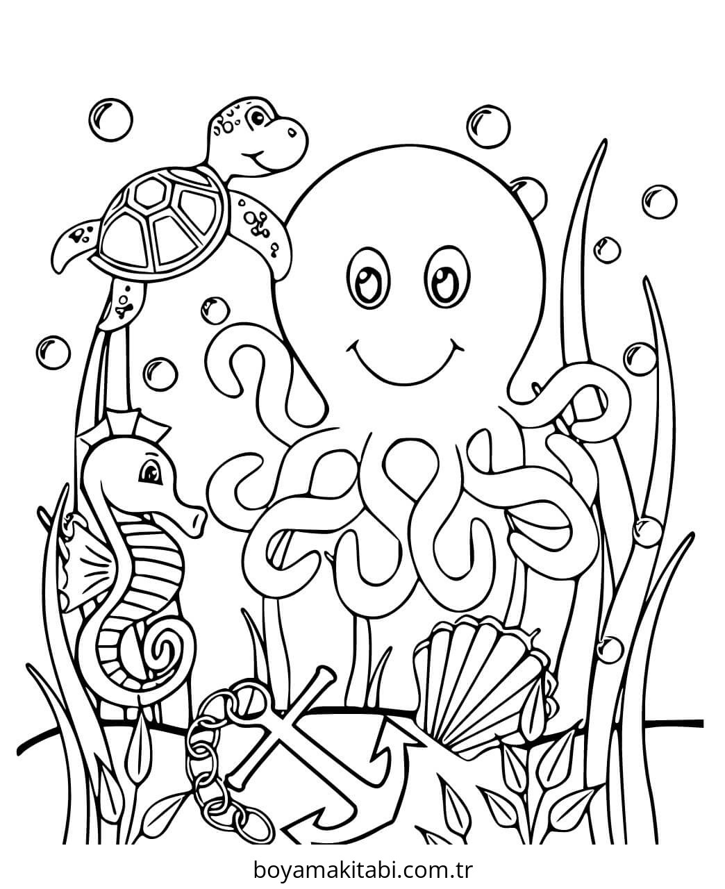 Deniz Hayvanları temalı bu boyama sayfası çocuklar için okul öncesi ve evde etkinlik bir etkinlik sunar. Ücretsiz olarak indirip yazdırabilir, evde keyifli bir boyama zamanı oluşturabilirsiniz.