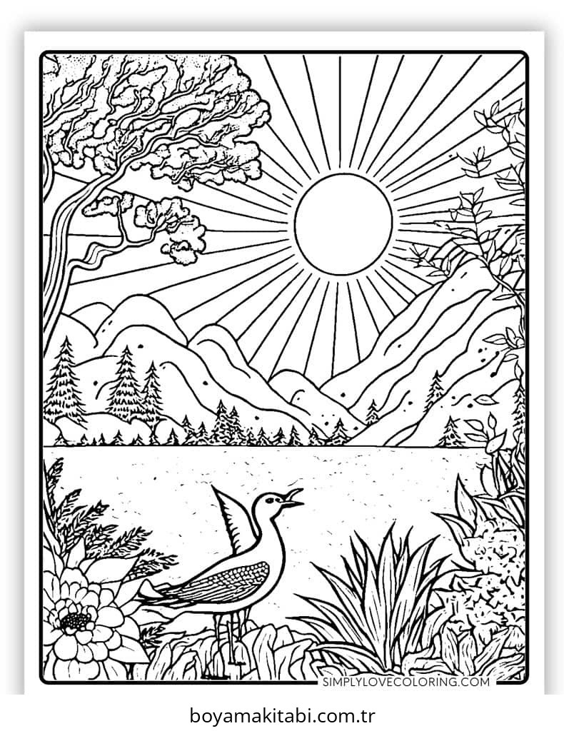 Doğa temalı bu boyama sayfası çocuklar için el becerilerini geliştirir ve boyama çalışması bir etkinlik sunar. Ücretsiz olarak indirip yazdırabilir, evde keyifli bir boyama zamanı oluşturabilirsiniz.