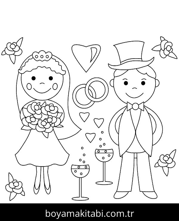 Düğün temalı bu boyama sayfası çocuklar için sevimli karakter ve sanatsal çalışma bir etkinlik sunar. Ücretsiz olarak indirip yazdırabilir, evde keyifli bir boyama zamanı oluşturabilirsiniz.