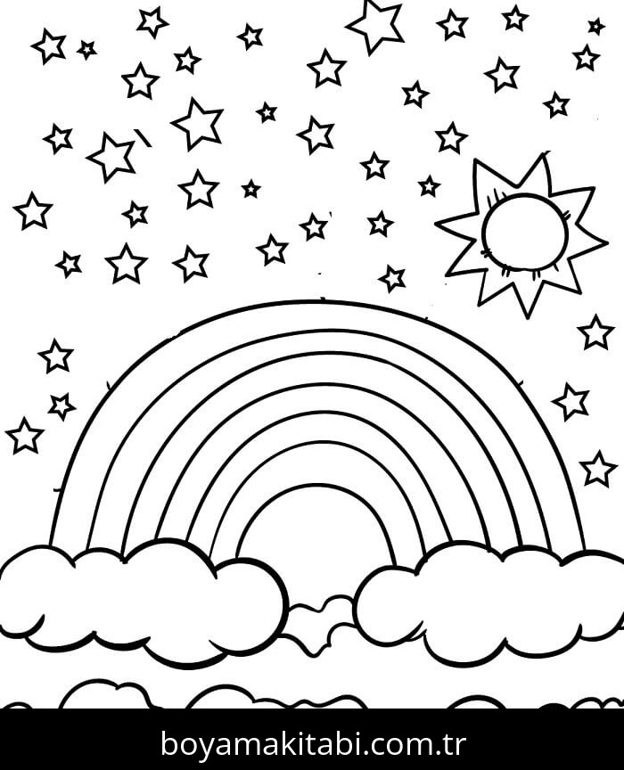 Gökkuşağı temalı bu boyama sayfası çocuklar için renkli çizimler ve okul öncesi bir etkinlik sunar. Ücretsiz olarak indirip yazdırabilir, evde keyifli bir boyama zamanı oluşturabilirsiniz.