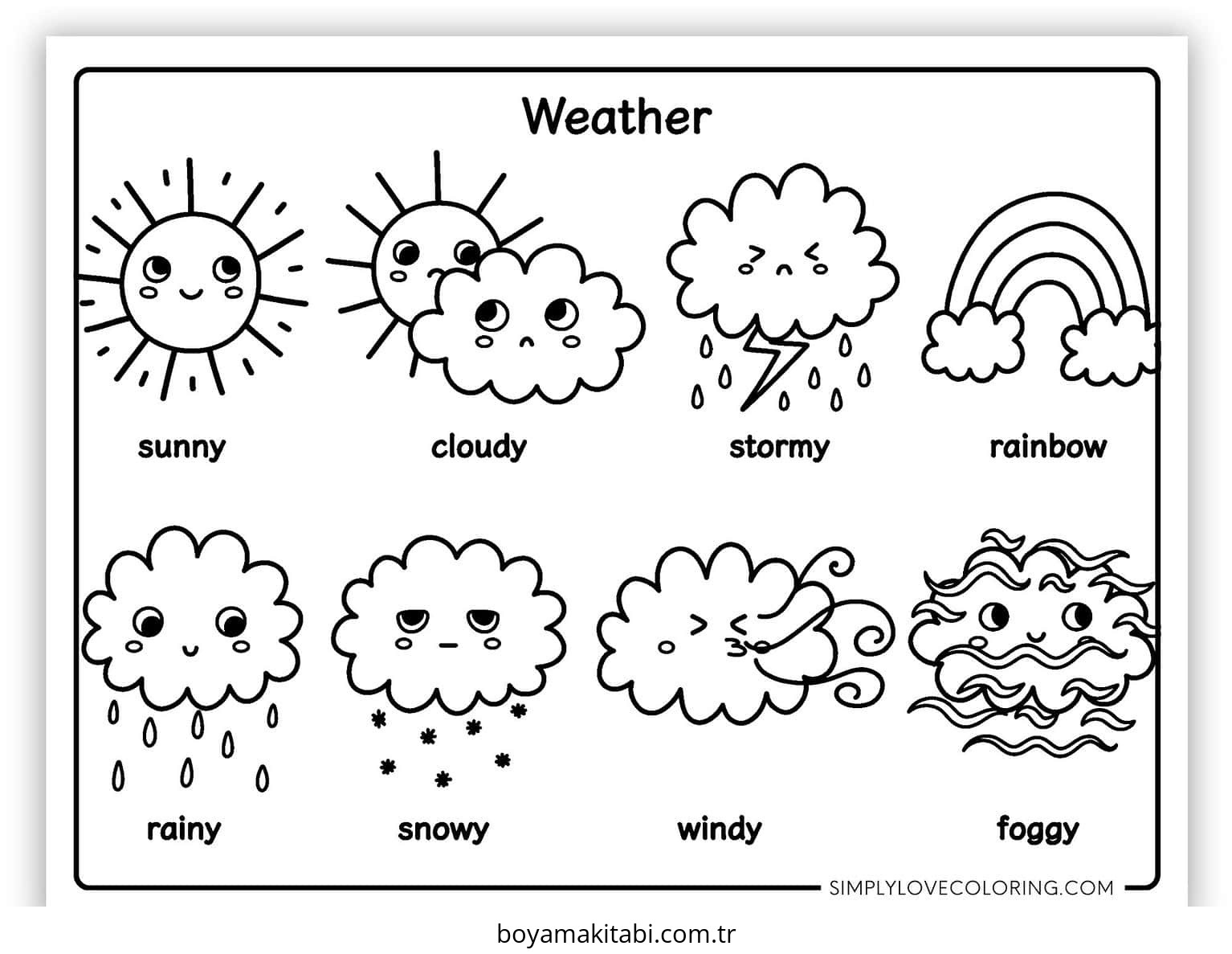 Hava Durumu temalı bu boyama sayfası çocuklar için basit çizim ve kolay boyama bir etkinlik sunar. Ücretsiz olarak indirip yazdırabilir, evde keyifli bir boyama zamanı oluşturabilirsiniz.