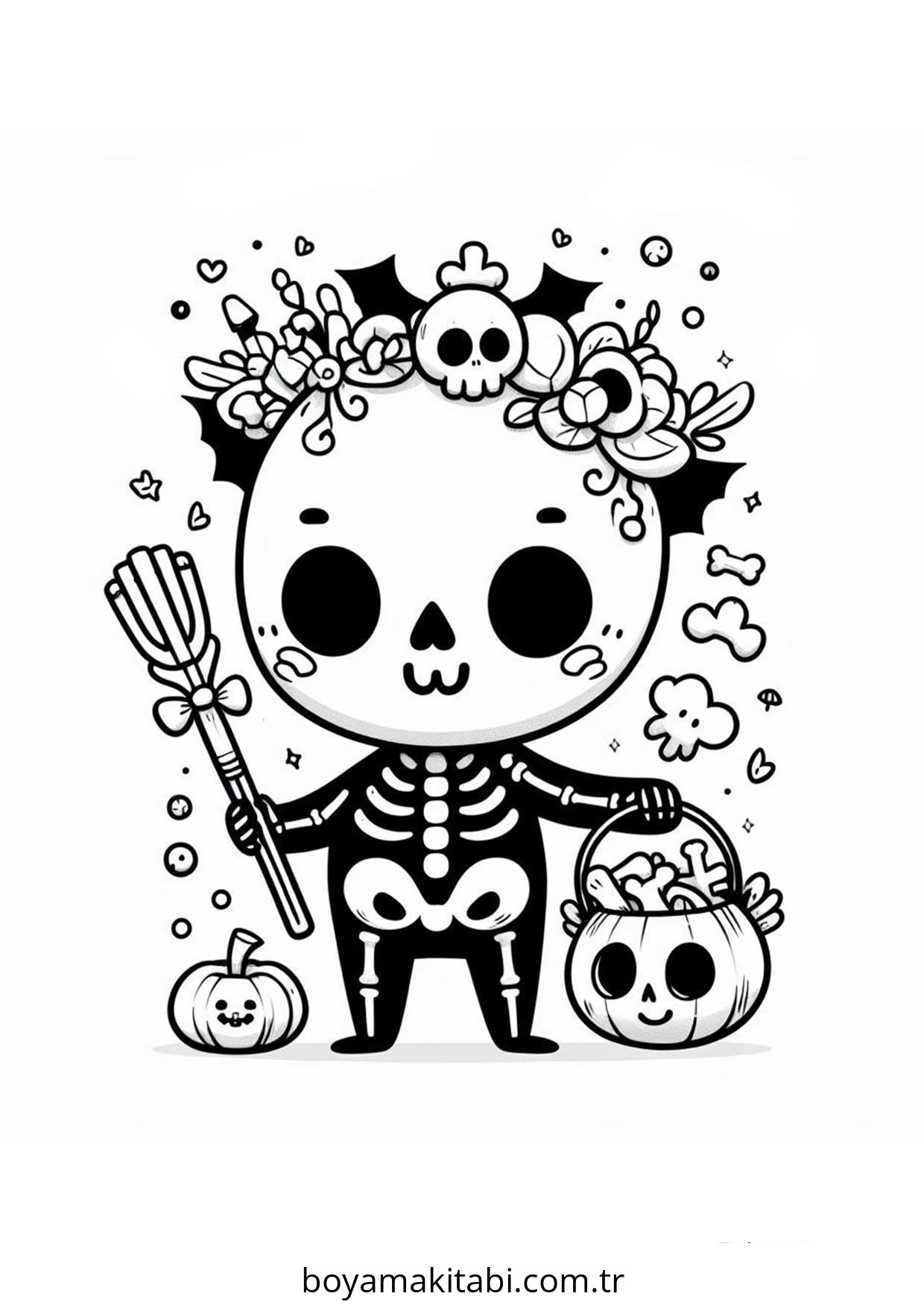 Iskelet temalı bu boyama sayfası çocuklar için renkli çizimler ve okul öncesi bir etkinlik sunar. Ücretsiz olarak indirip yazdırabilir, evde keyifli bir boyama zamanı oluşturabilirsiniz.