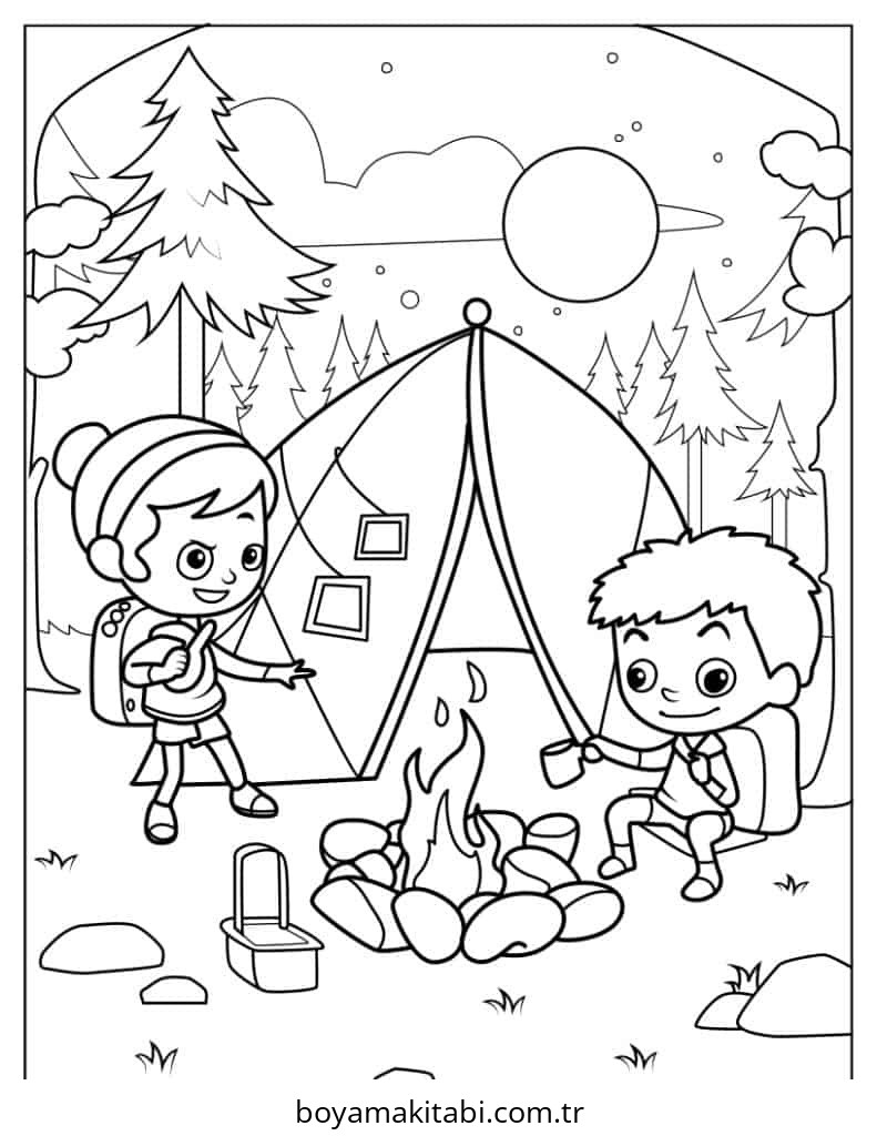 Kamp temalı bu boyama sayfası çocuklar için okul öncesi ve evde etkinlik bir etkinlik sunar. Ücretsiz olarak indirip yazdırabilir, evde keyifli bir boyama zamanı oluşturabilirsiniz.