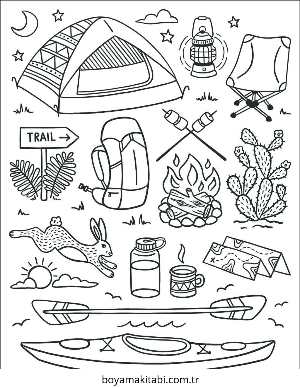 Kamp temalı bu boyama sayfası çocuklar için evde etkinlik ve ücretsiz yazdır bir etkinlik sunar. Ücretsiz olarak indirip yazdırabilir, evde keyifli bir boyama zamanı oluşturabilirsiniz.
