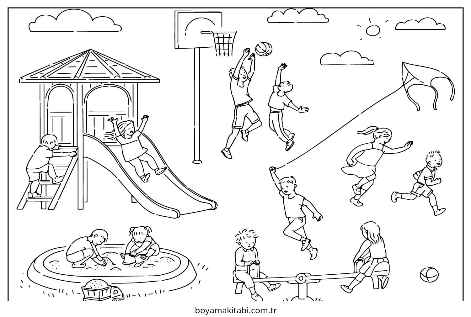 Oyun Parkı temalı bu boyama sayfası çocuklar için okul öncesi ve evde etkinlik bir etkinlik sunar. Ücretsiz olarak indirip yazdırabilir, evde keyifli bir boyama zamanı oluşturabilirsiniz.