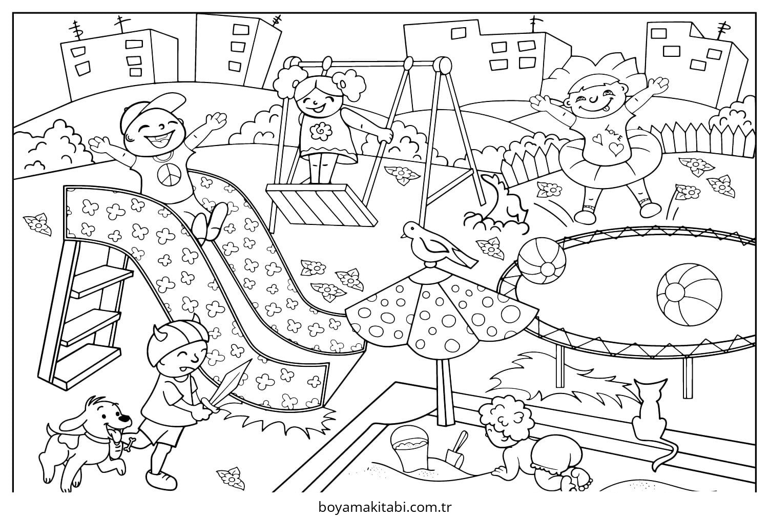 Oyun Parkı temalı bu boyama sayfası çocuklar için keyifli zaman ve renkli çizimler bir etkinlik sunar. Ücretsiz olarak indirip yazdırabilir, evde keyifli bir boyama zamanı oluşturabilirsiniz.