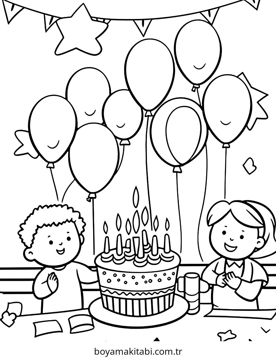 Parti temalı bu boyama sayfası çocuklar için eğitici aktivite ve yaratıcılık bir etkinlik sunar. Ücretsiz olarak indirip yazdırabilir, evde keyifli bir boyama zamanı oluşturabilirsiniz.