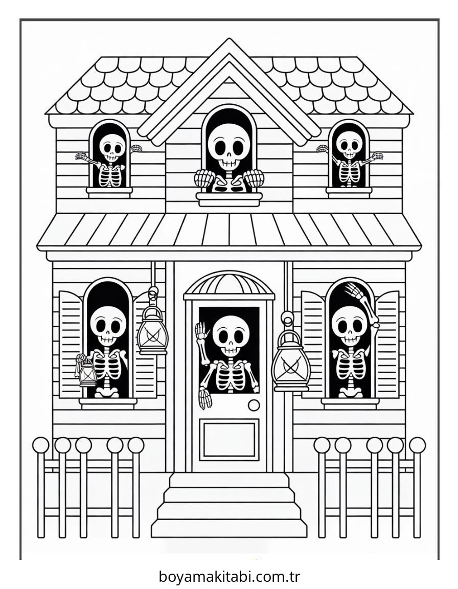 Perili Ev temalı bu boyama sayfası çocuklar için el becerilerini geliştirir ve boyama çalışması bir etkinlik sunar. Ücretsiz olarak indirip yazdırabilir, evde keyifli bir boyama zamanı oluşturabilirsiniz.