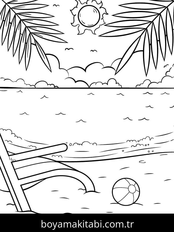 Plaj temalı bu boyama sayfası çocuklar için basit çizim ve kolay boyama bir etkinlik sunar. Ücretsiz olarak indirip yazdırabilir, evde keyifli bir boyama zamanı oluşturabilirsiniz.