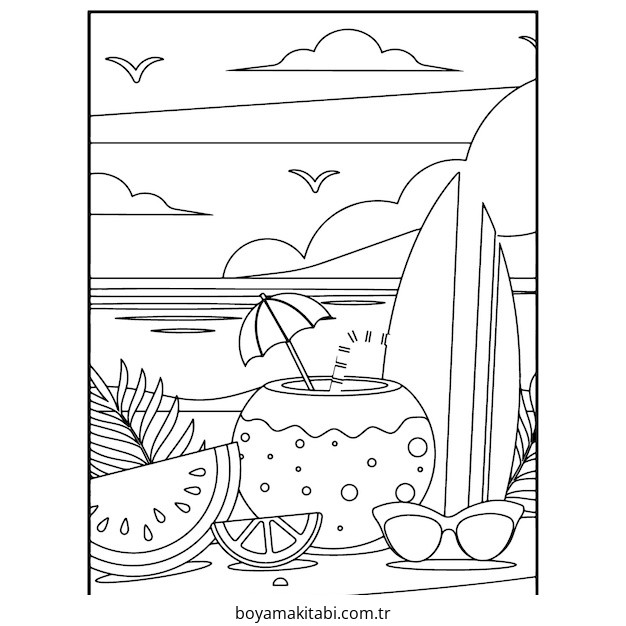 Plaj temalı bu boyama sayfası çocuklar için eğitici aktivite ve yaratıcılık bir etkinlik sunar. Ücretsiz olarak indirip yazdırabilir, evde keyifli bir boyama zamanı oluşturabilirsiniz.