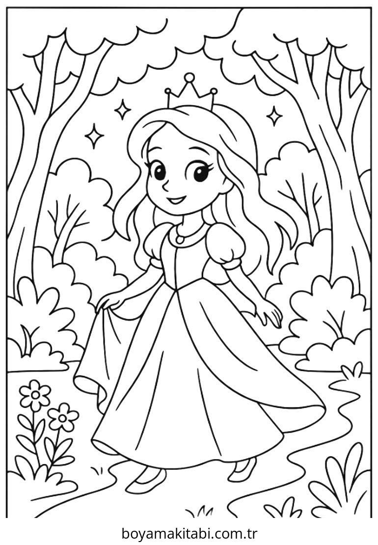 Prenses temalı bu boyama sayfası çocuklar için el becerilerini geliştirir ve boyama çalışması bir etkinlik sunar. Ücretsiz olarak indirip yazdırabilir, evde keyifli bir boyama zamanı oluşturabilirsiniz.
