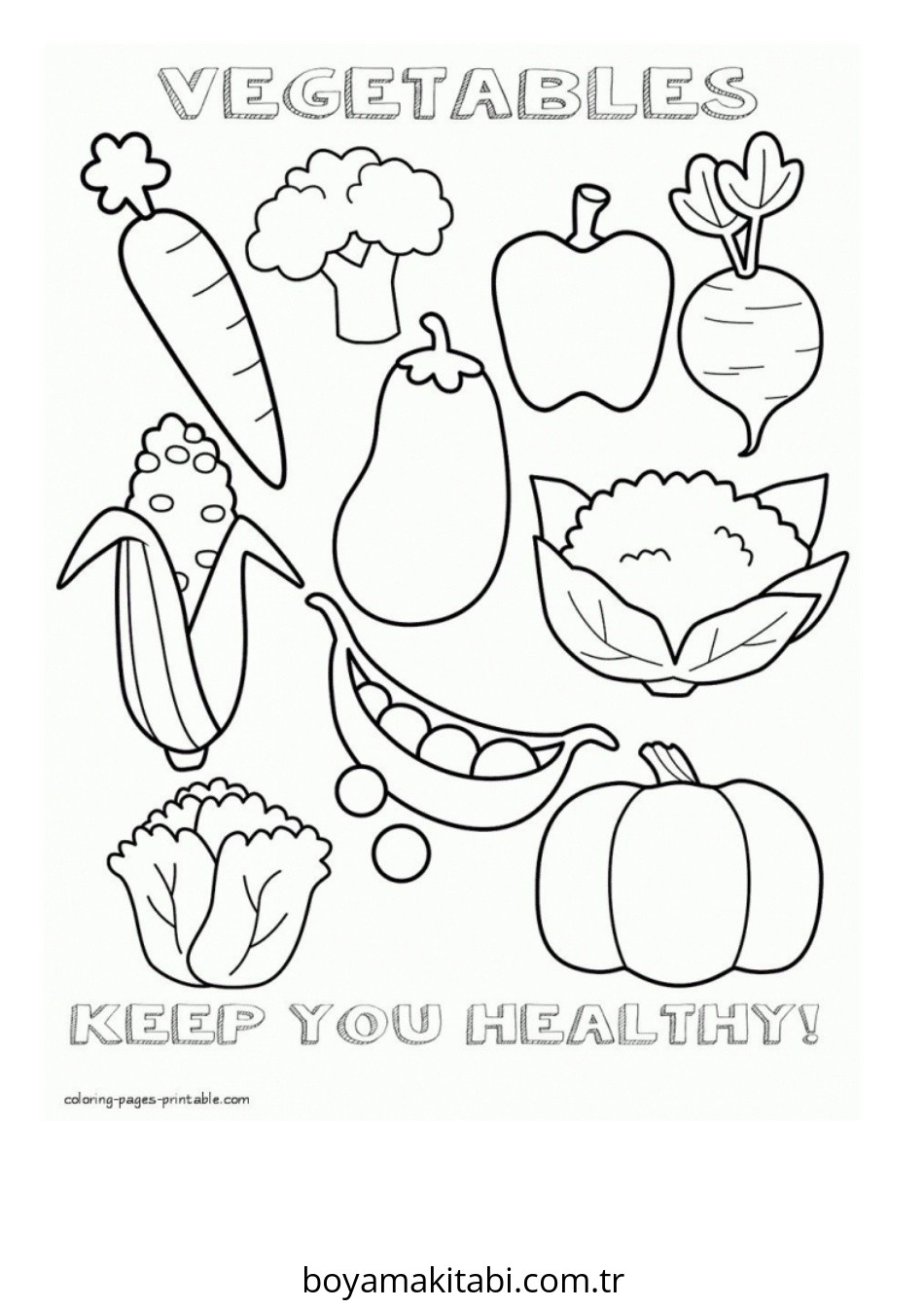 Sebze temalı bu boyama sayfası çocuklar için sanatsal çalışma ve çocuklar için bir etkinlik sunar. Ücretsiz olarak indirip yazdırabilir, evde keyifli bir boyama zamanı oluşturabilirsiniz.