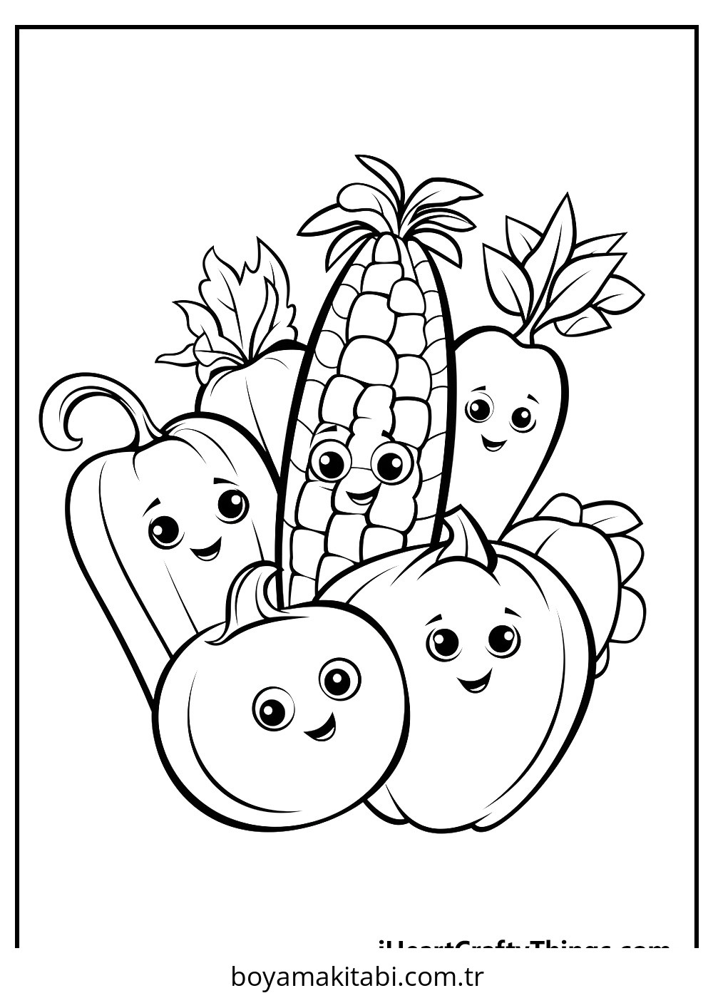 Sebze temalı bu boyama sayfası çocuklar için boyama çalışması ve yaratıcılığı geliştirir bir etkinlik sunar. Ücretsiz olarak indirip yazdırabilir, evde keyifli bir boyama zamanı oluşturabilirsiniz.