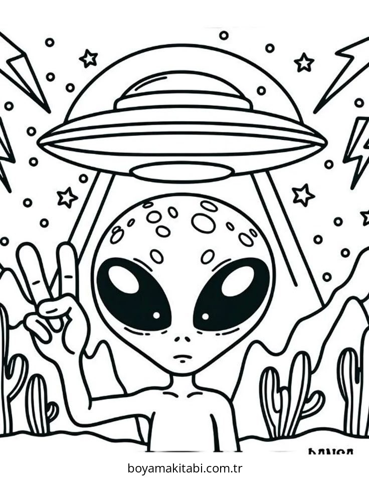 Uzaylı temalı bu boyama sayfası çocuklar için sanatsal çalışma ve çocuklar için bir etkinlik sunar. Ücretsiz olarak indirip yazdırabilir, evde keyifli bir boyama zamanı oluşturabilirsiniz.