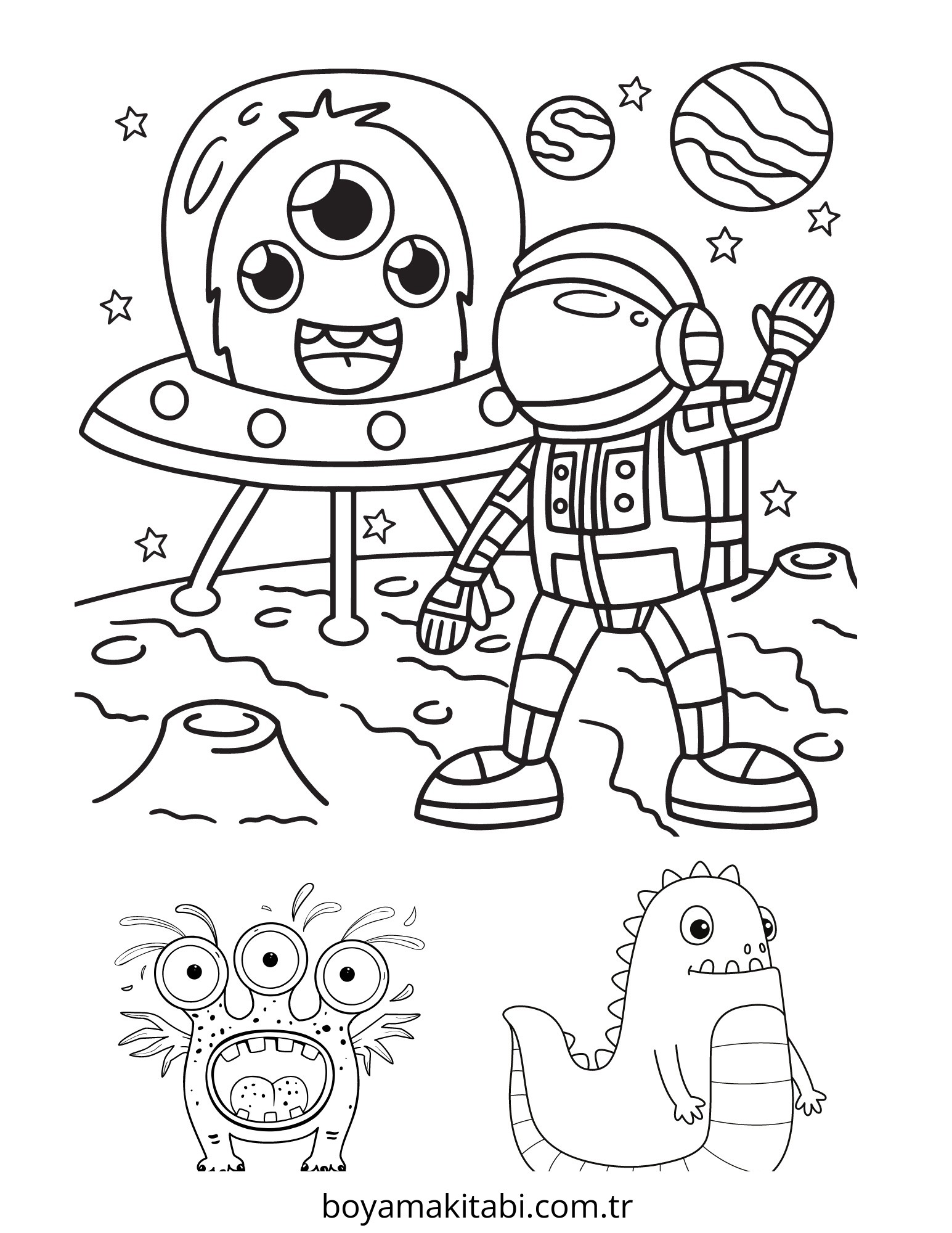 Uzaylı temalı bu boyama sayfası çocuklar için yaratıcılığı geliştirir ve keyifli zaman bir etkinlik sunar. Ücretsiz olarak indirip yazdırabilir, evde keyifli bir boyama zamanı oluşturabilirsiniz.