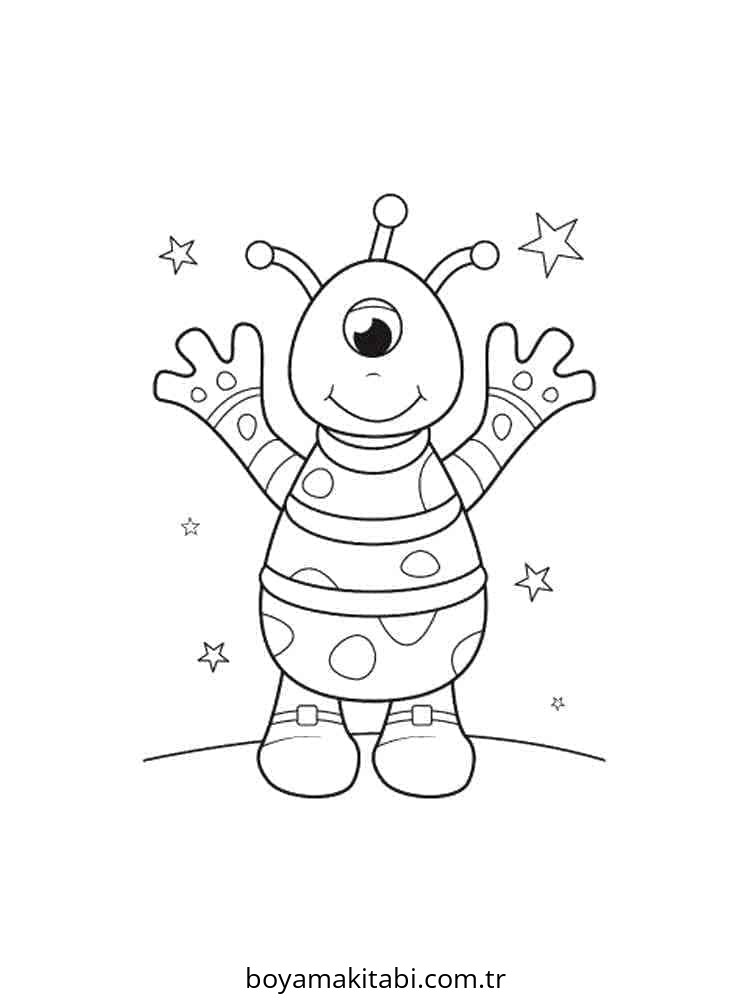 Uzaylılar temalı bu boyama sayfası çocuklar için renkli çizimler ve okul öncesi bir etkinlik sunar. Ücretsiz olarak indirip yazdırabilir, evde keyifli bir boyama zamanı oluşturabilirsiniz.