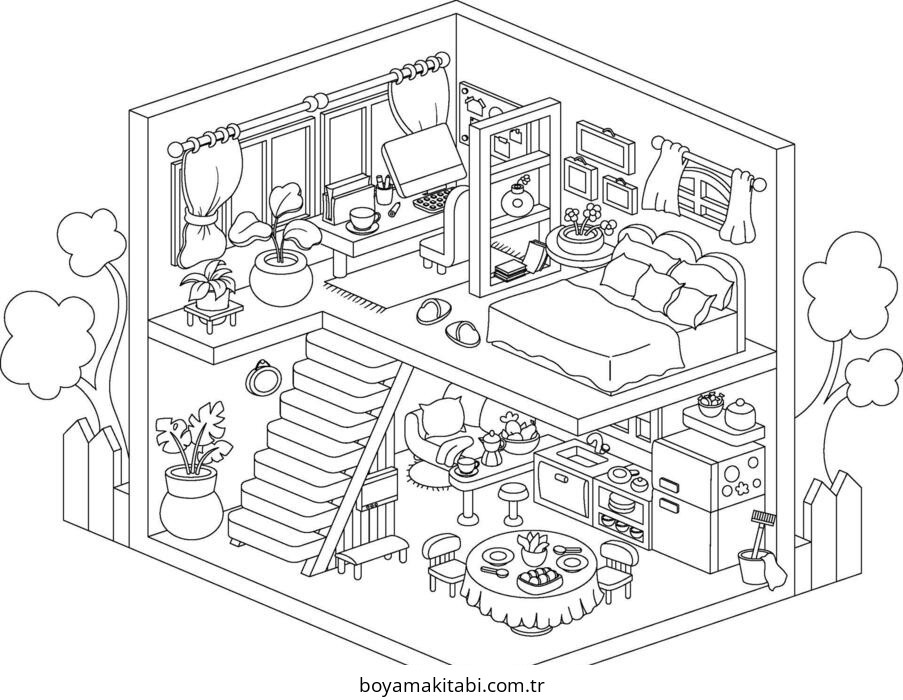 Yatak Odası temalı bu boyama sayfası çocuklar için okul öncesi ve evde etkinlik bir etkinlik sunar. Ücretsiz olarak indirip yazdırabilir, evde keyifli bir boyama zamanı oluşturabilirsiniz.