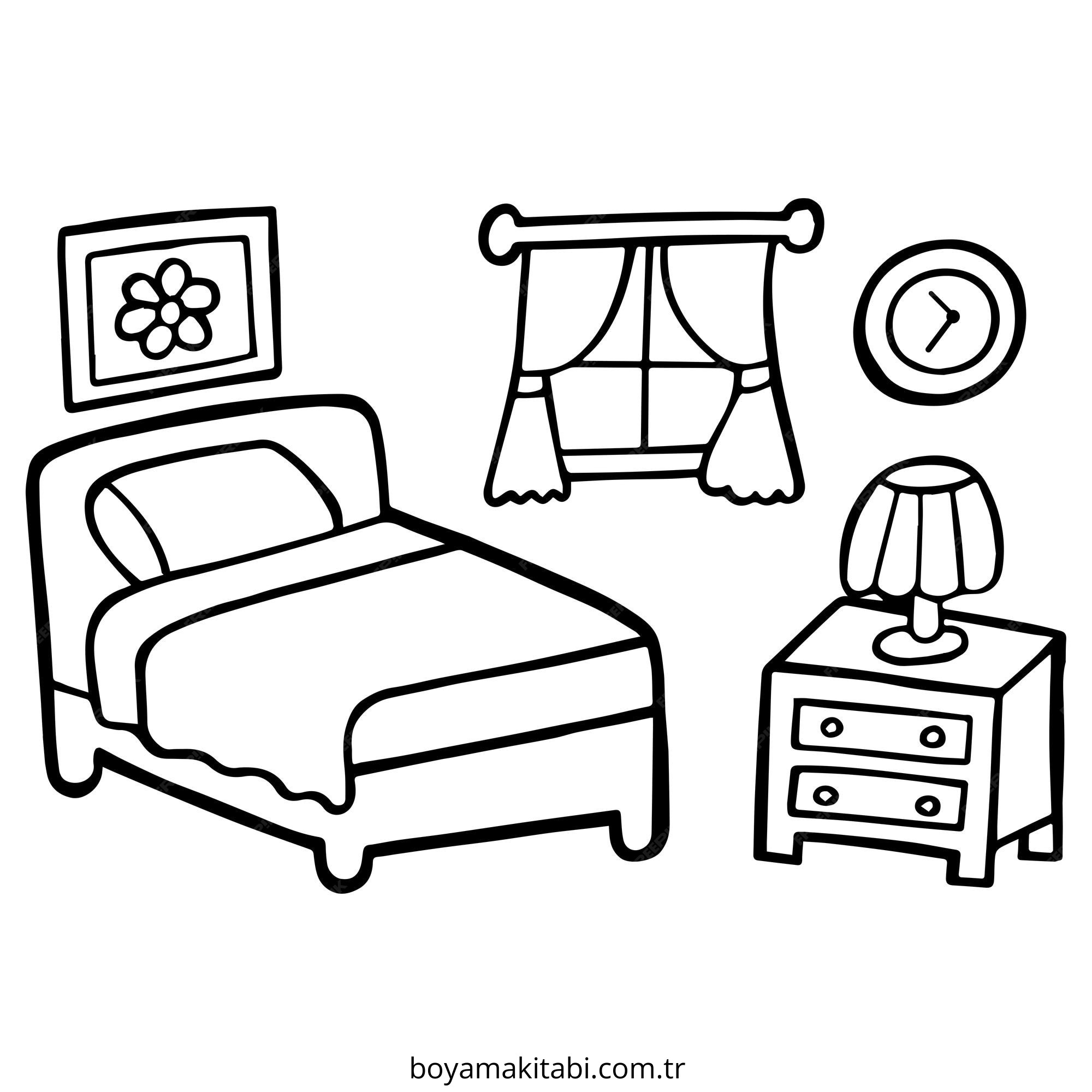 Yatak Odası temalı bu boyama sayfası çocuklar için boyama etkinliği ve çocuk aktivitesi bir etkinlik sunar. Ücretsiz olarak indirip yazdırabilir, evde keyifli bir boyama zamanı oluşturabilirsiniz.