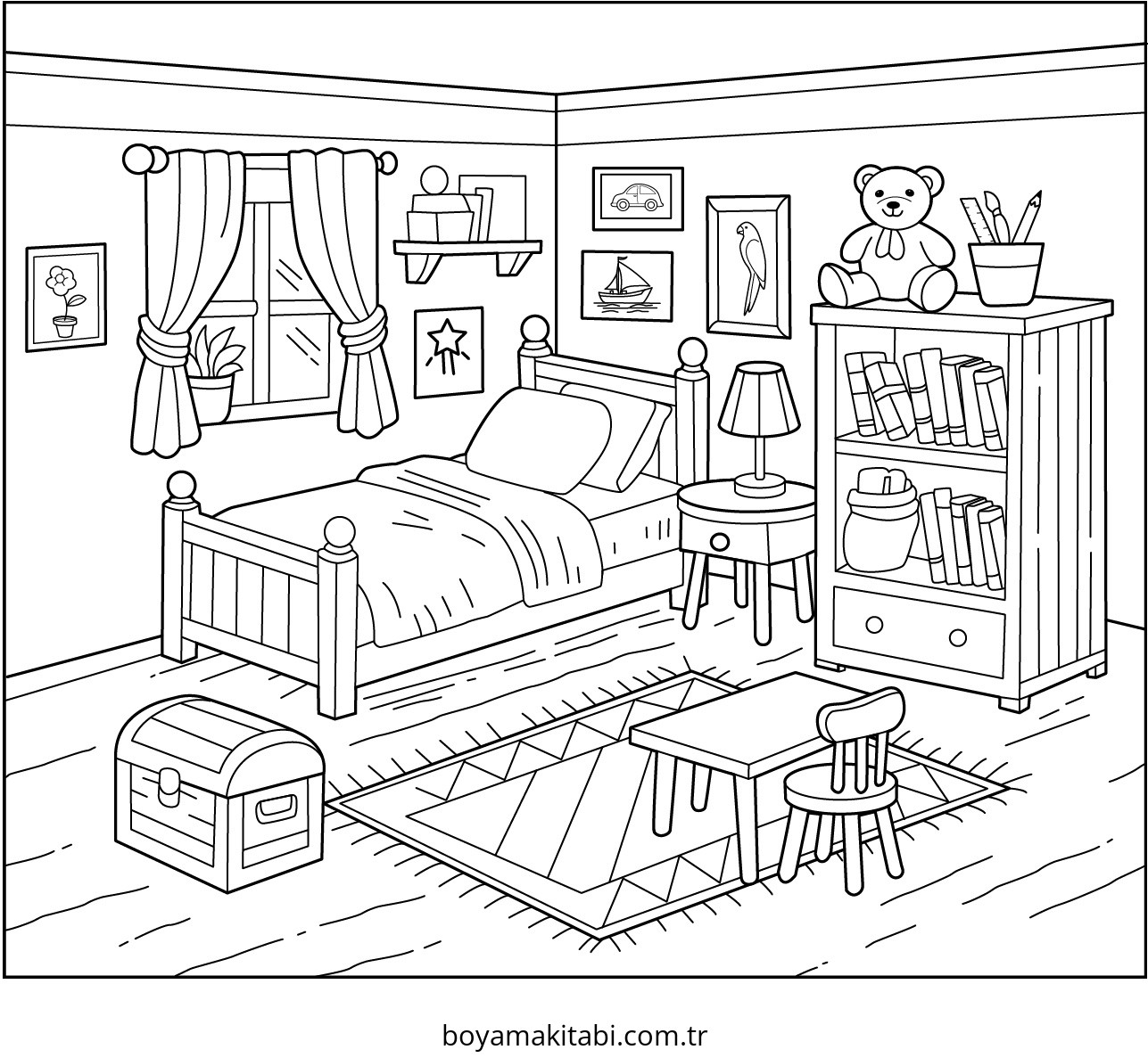 Yatak Odası temalı bu boyama sayfası çocuklar için sevimli karakter ve sanatsal çalışma bir etkinlik sunar. Ücretsiz olarak indirip yazdırabilir, evde keyifli bir boyama zamanı oluşturabilirsiniz.