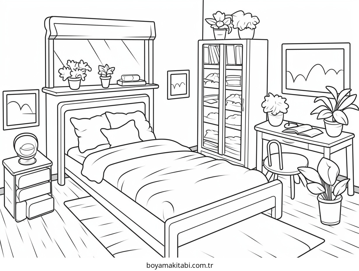 Yatak Odası temalı bu boyama sayfası çocuklar için sevimli karakter ve sanatsal çalışma bir etkinlik sunar. Ücretsiz olarak indirip yazdırabilir, evde keyifli bir boyama zamanı oluşturabilirsiniz.