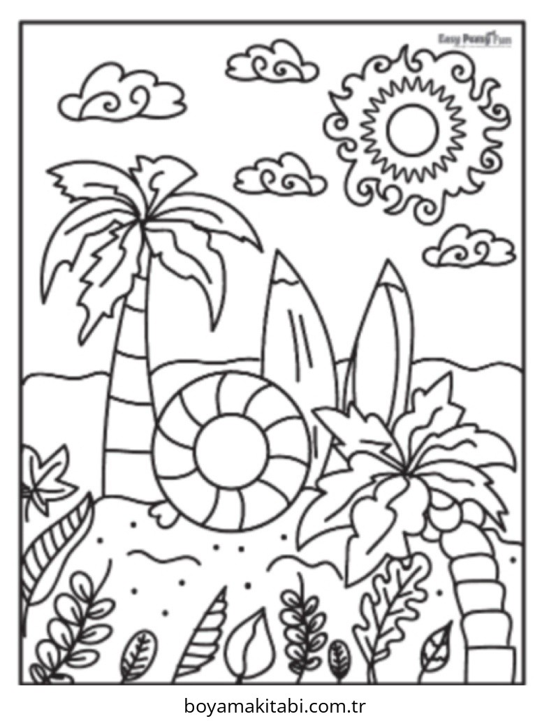 Yaz temalı bu boyama sayfası çocuklar için keyifli zaman ve renkli çizimler bir etkinlik sunar. Ücretsiz olarak indirip yazdırabilir, evde keyifli bir boyama zamanı oluşturabilirsiniz.