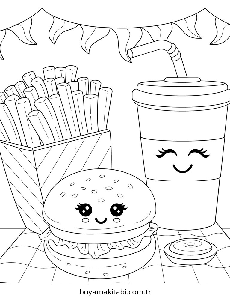 Yiyecekler temalı bu boyama sayfası çocuklar için keyifli zaman ve renkli çizimler bir etkinlik sunar. Ücretsiz olarak indirip yazdırabilir, evde keyifli bir boyama zamanı oluşturabilirsiniz.
